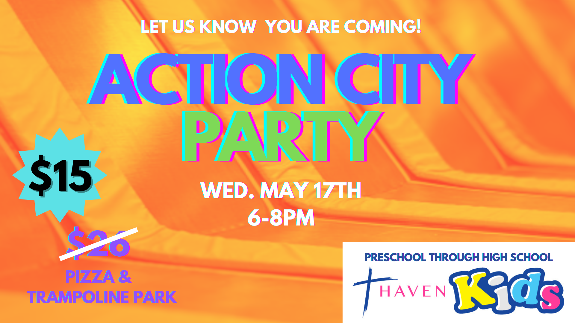 $15 will get you a pizza buffet, soda and two hours of jumping on the trampolines. Please bring the money with you to Action City. Checks can be made out to Haven Church. Would you like to help other children be able to have the experience?